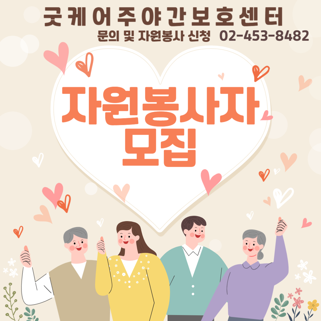 굿케어주야간보호센터에서 자원봉사자님들을 모집합니다. 많은 관심 부탁드립니다. ^^ https://blog.naver.com/goodcare2021/223566243233