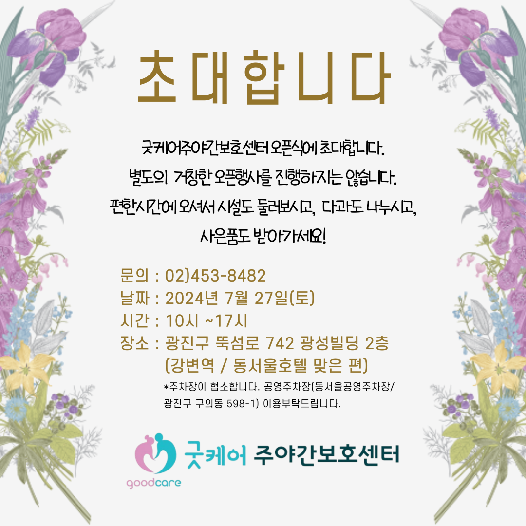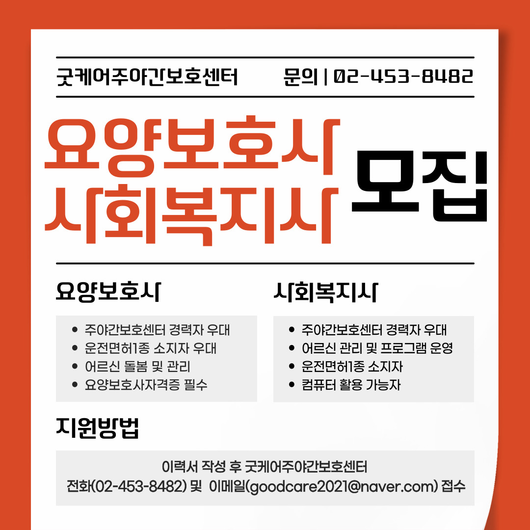 굿케어주야간보호센터에서 어르신을 돌볼 요양보호사와 사회복지사를 모집합니다. 관심있는분들의 많은 지원 바랍니다. 전화문의 02)453-8482 이메일접수 goodcare2021@naver.com https://blog.naver.com/goodcare2021/223505772781
