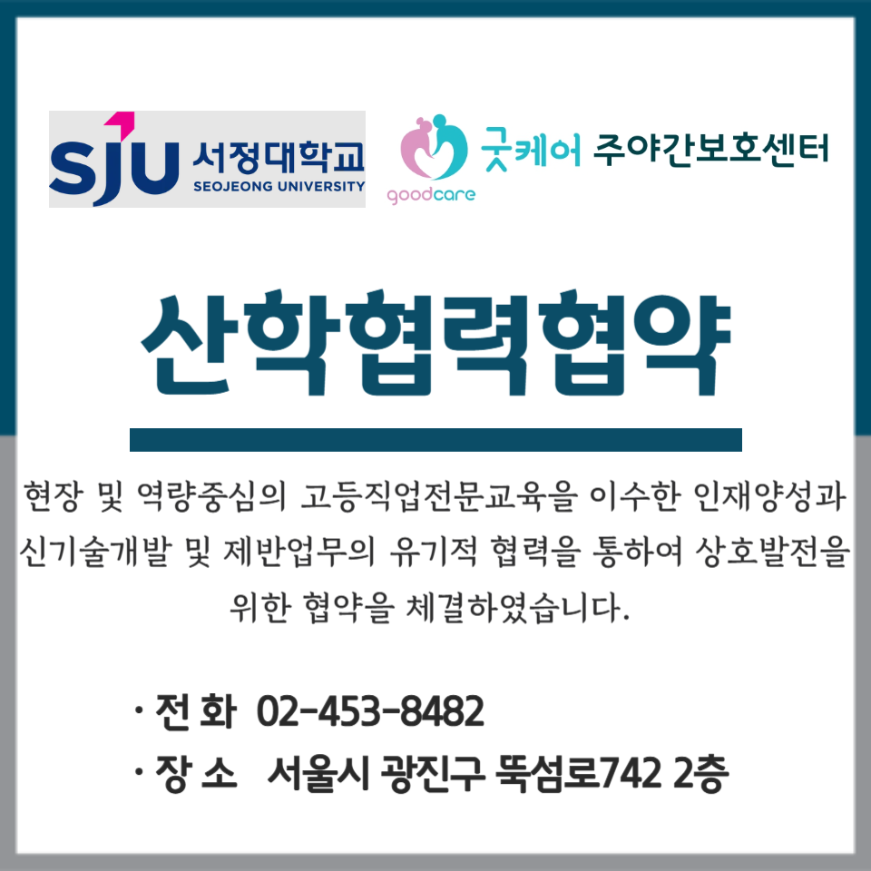 굿케어주야간보호센터는 서정대학교과 산학협력협약을 진행하였습니다. https://blog.naver.com/goodcare2021/223894480051