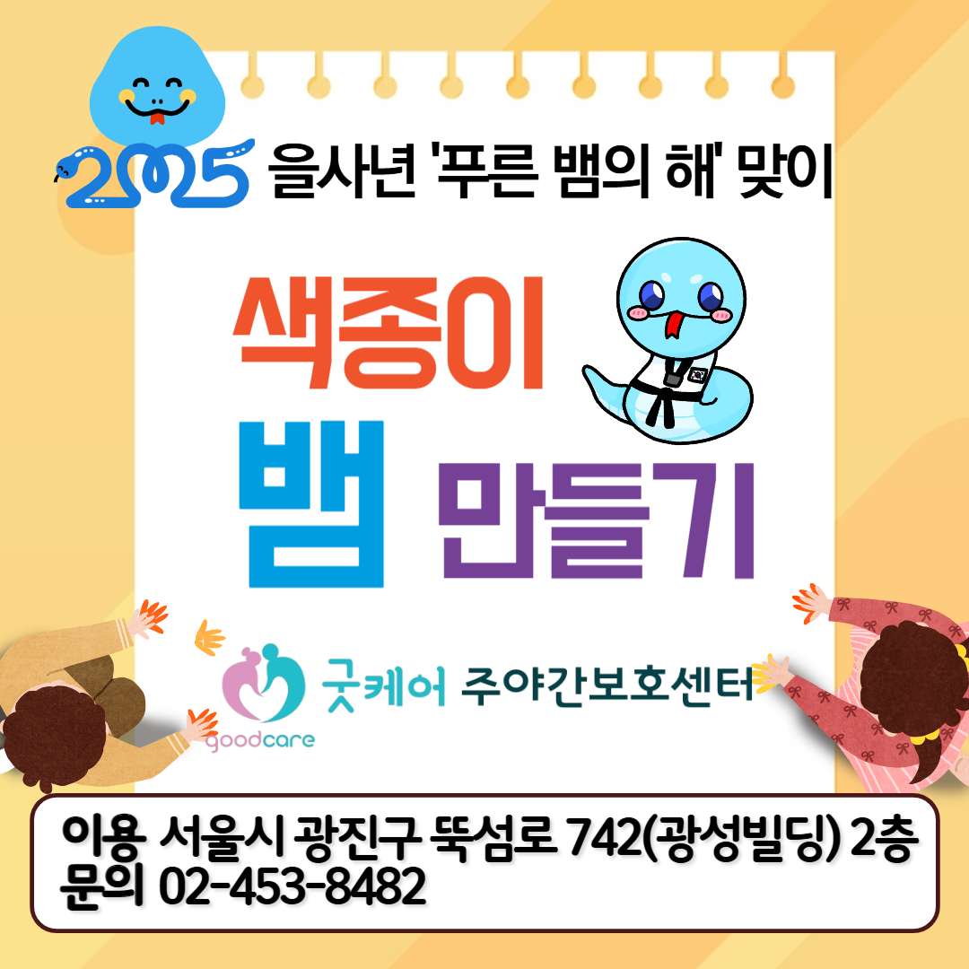 굿케어주야간보호센터에서는 을사년 푸른 뱀의 해를 맞이하여 색종이를 활용한 뱀만들기를 진행하였습니다. https://blog.naver.com/goodcare2021/223716046789